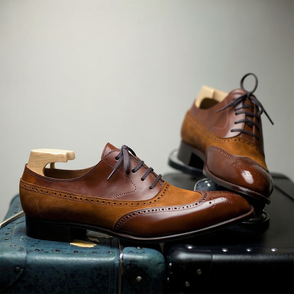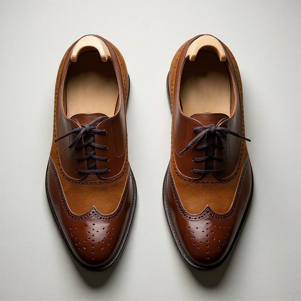 Tan Leather and Suede Cedara Brogue Wingtip Oxfords - Formal Shoes