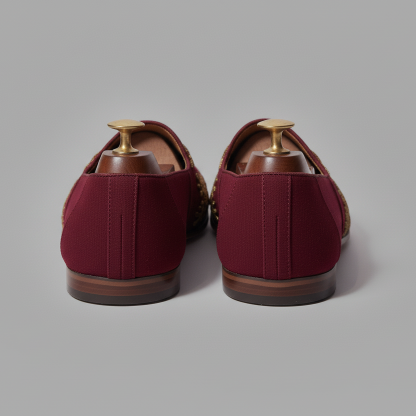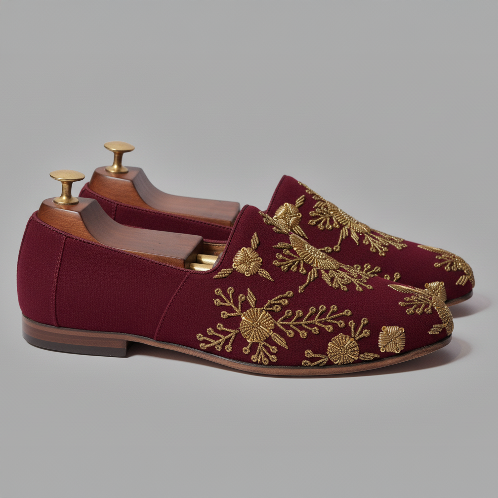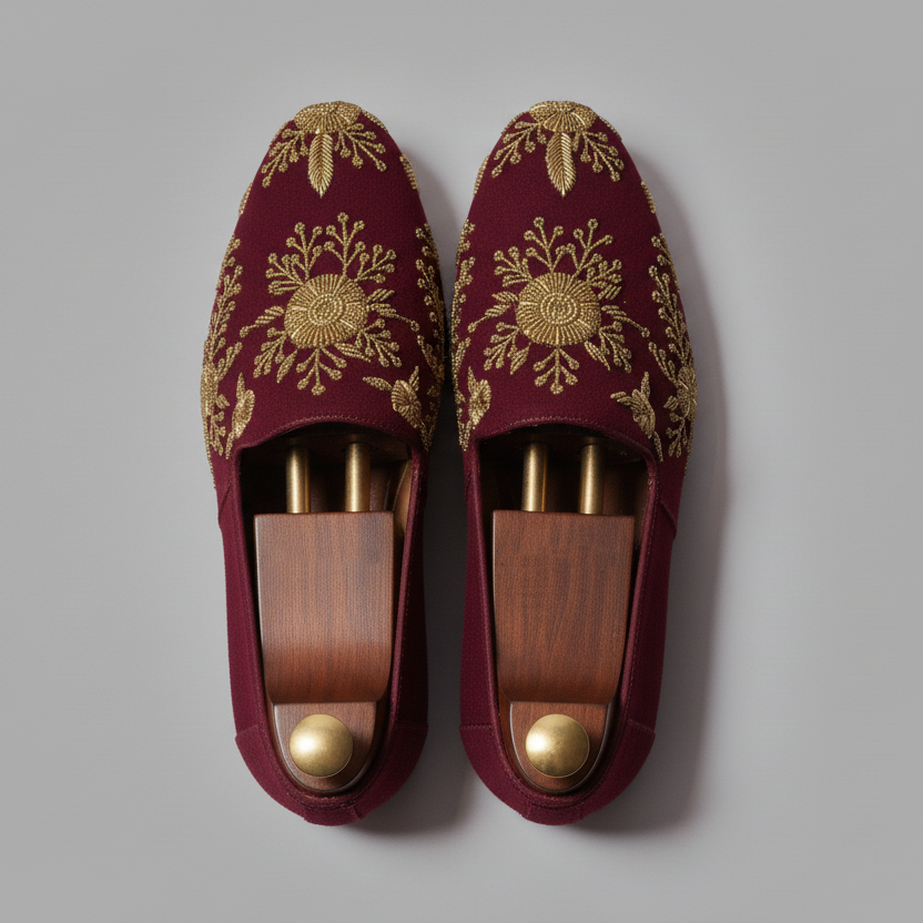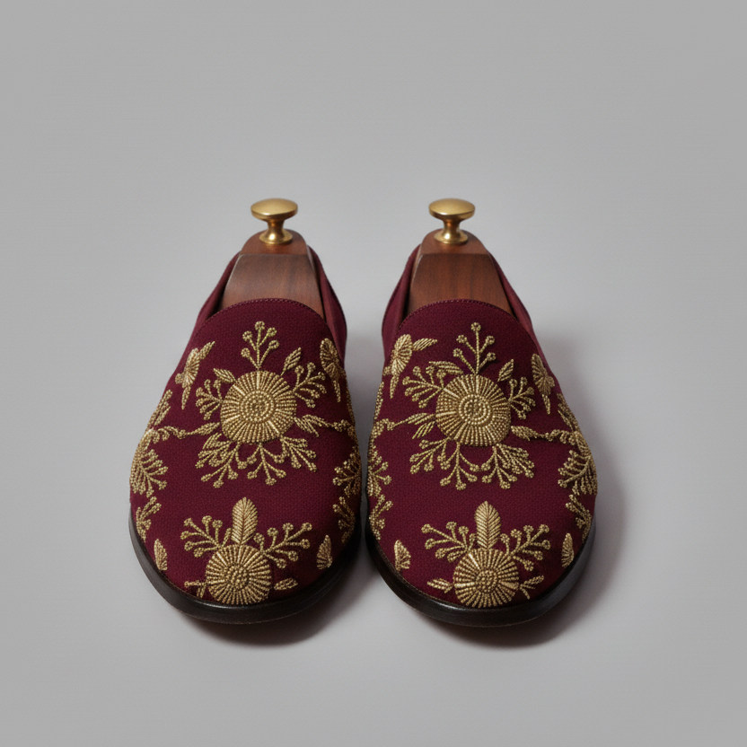 Burgundy Velvet Tana Peshawari Hand Embroidered Zardozi Loafers | Wedding Shoes for Groom | Shoes for Haldi Mehendi Sangeet