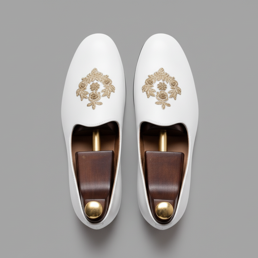 White Leather Tana Peshawari Hand Work Embroidered Zardozi Jutti Loafers | Wedding Shoes for Groom | Shoes for Haldi Mehendi Sangeet