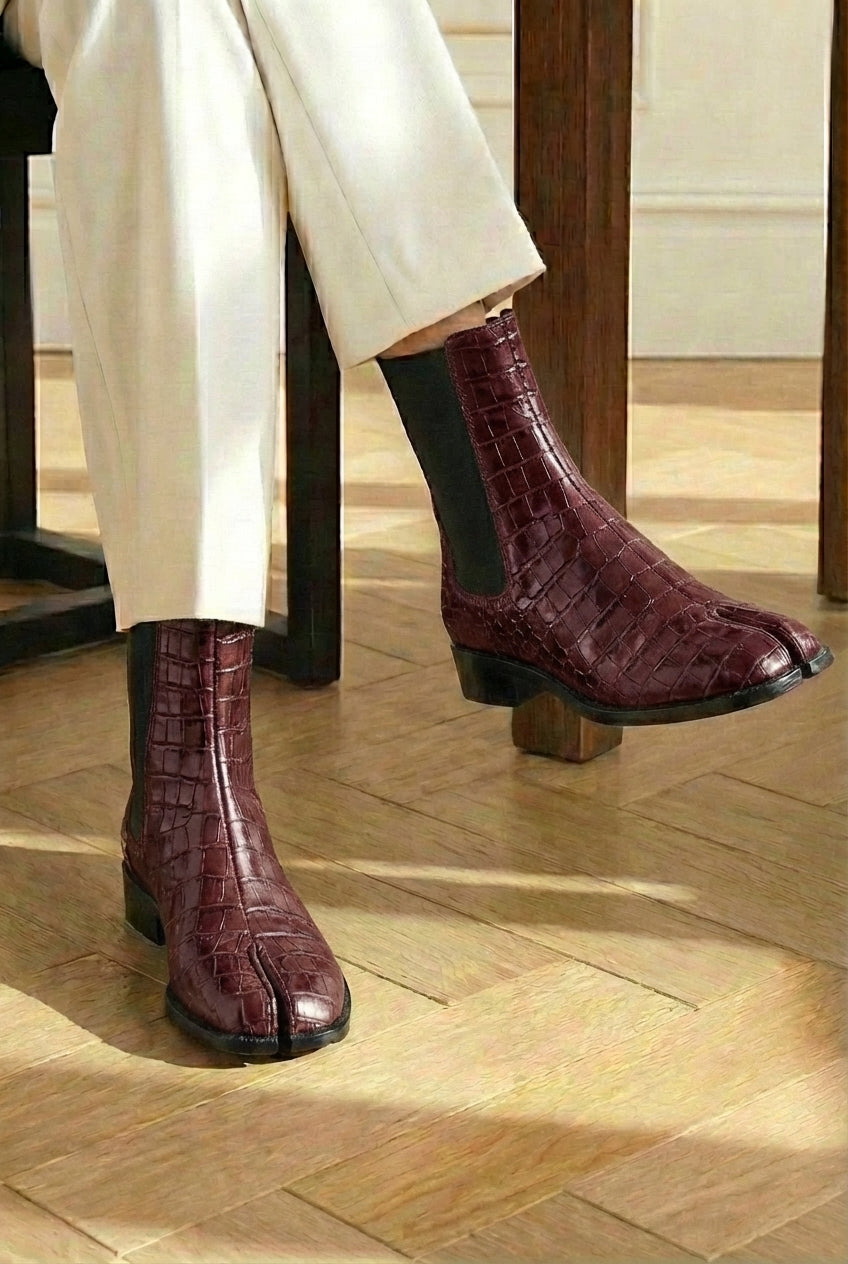 Burgundy Croc Print Leather Amino With Split Toe Chelsea Boot