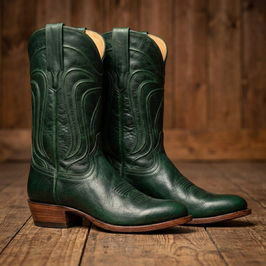 Green Leather Renovaux Slip On Zipper Western Cowboy Boots - AW24