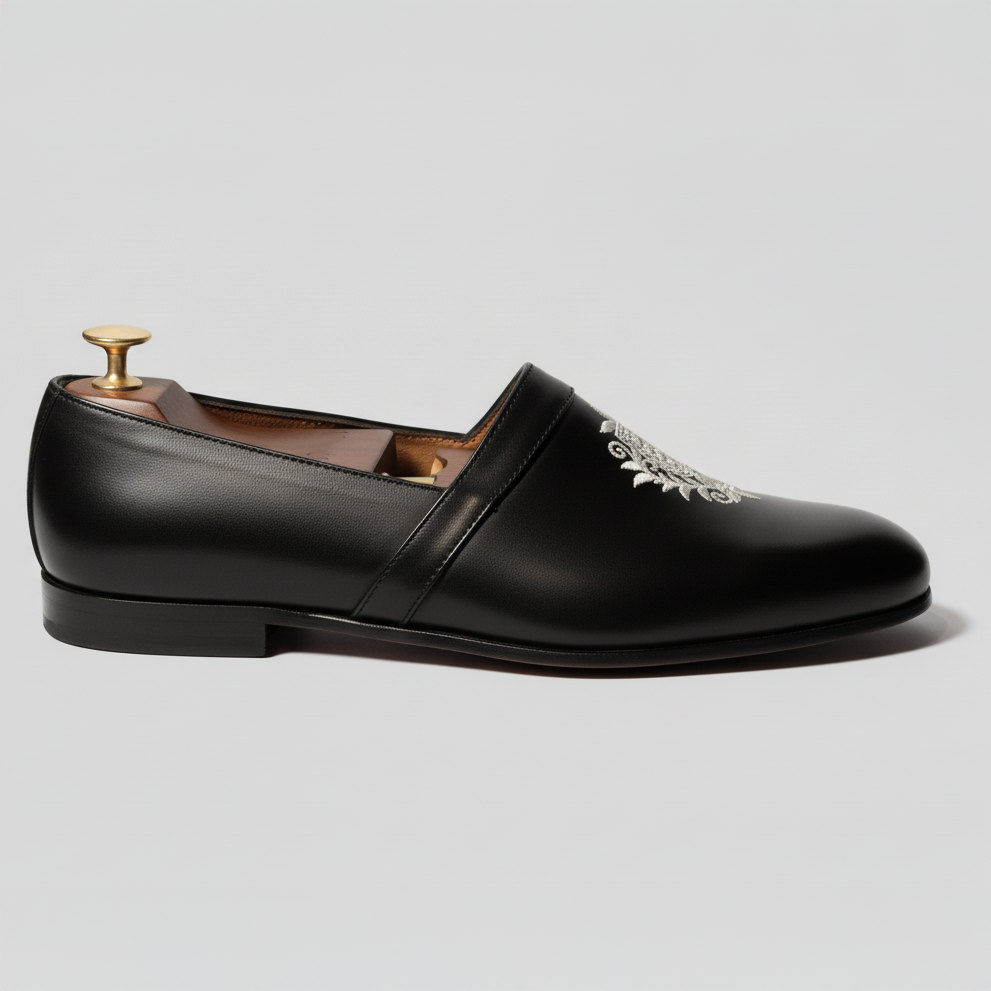 Black Leather Tana Embroidered Peshawari Loafers | Wedding Shoes for Groom | Shoes for Haldi Mehendi Sangeet