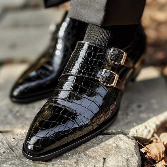 Black Croc Print Leather Algarve Single Monk Straps - AW24 : The Dapper Edit